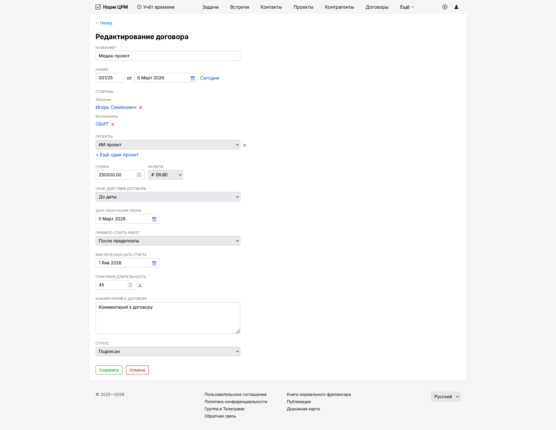 Дальше я буду работать над связями договоров с другими сущностями НормЦРМ — задачами, встречами и т.п. Чтобы можно было видеть, например, сколько часов было отработано по тому или иному договору и какая в итоге получается стоимость часа, если договор был оценён «под ключ».