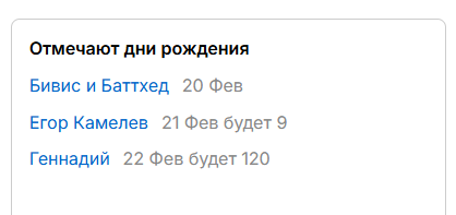 - На дэшборде появился новый блок: «Отмечают дни рождения». Там выводится перечень именников за ближайшие трое суток.