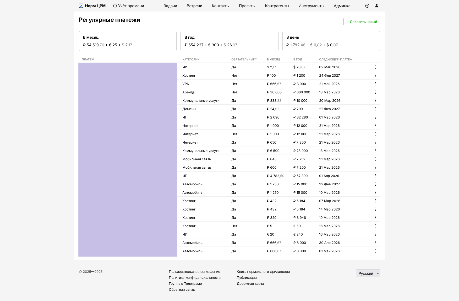 В целом испытал разочарование. Раздел прикольный, всё классно работает. И да, теперь я знаю, сколько трачу на регулярные платежи (а также потихоньку дополняю этот список платежами, о которых вспоминаю совершенно случайно; например: премиум-аккаунт для Телеграма или оплата смс-оповещений для банковской карты). Но не понимаю, что дальше делать с этой информацией. Видимо, потенциал у раздела не очень большой. Максимум, добавлю там уведомления о грядущих списаниях, и заморожу до тех пор, пока в НормЦРМ не появится полноценной системы финансового учёта.
