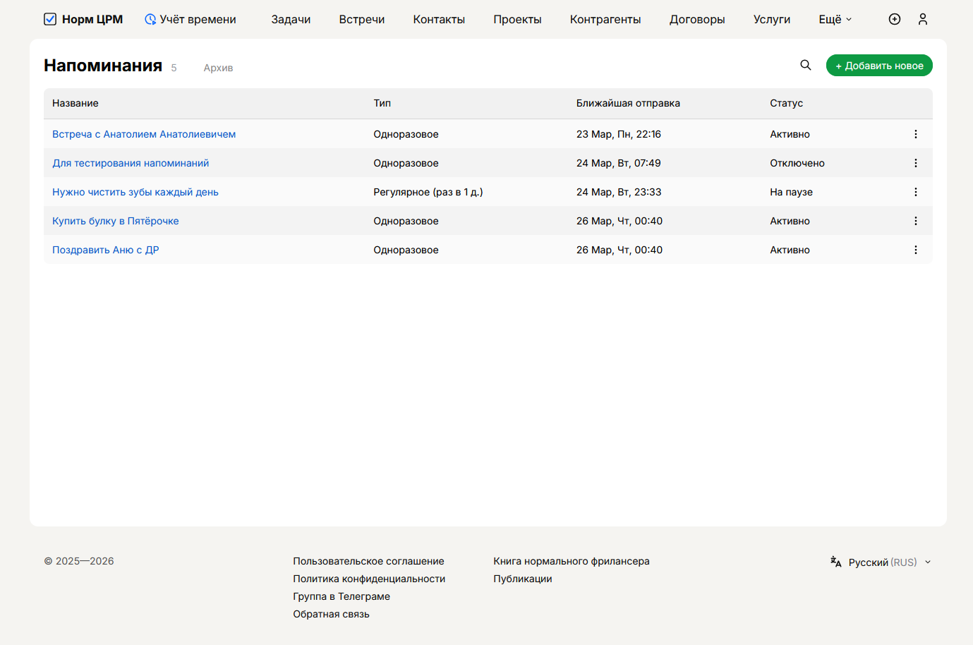 - Вынесу список отправленных напоминаний в дэшборд (если пользователь пропустит письмо, он всё равно увидит напоминание в интерфейсе НормЦРМ, пусть и с опозданием)