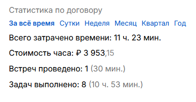 - Появился блок со статистикой по договору: сколько всего было времени затрачено, на что конкретно, и какая получается стоимость часа, исходя из этих данных